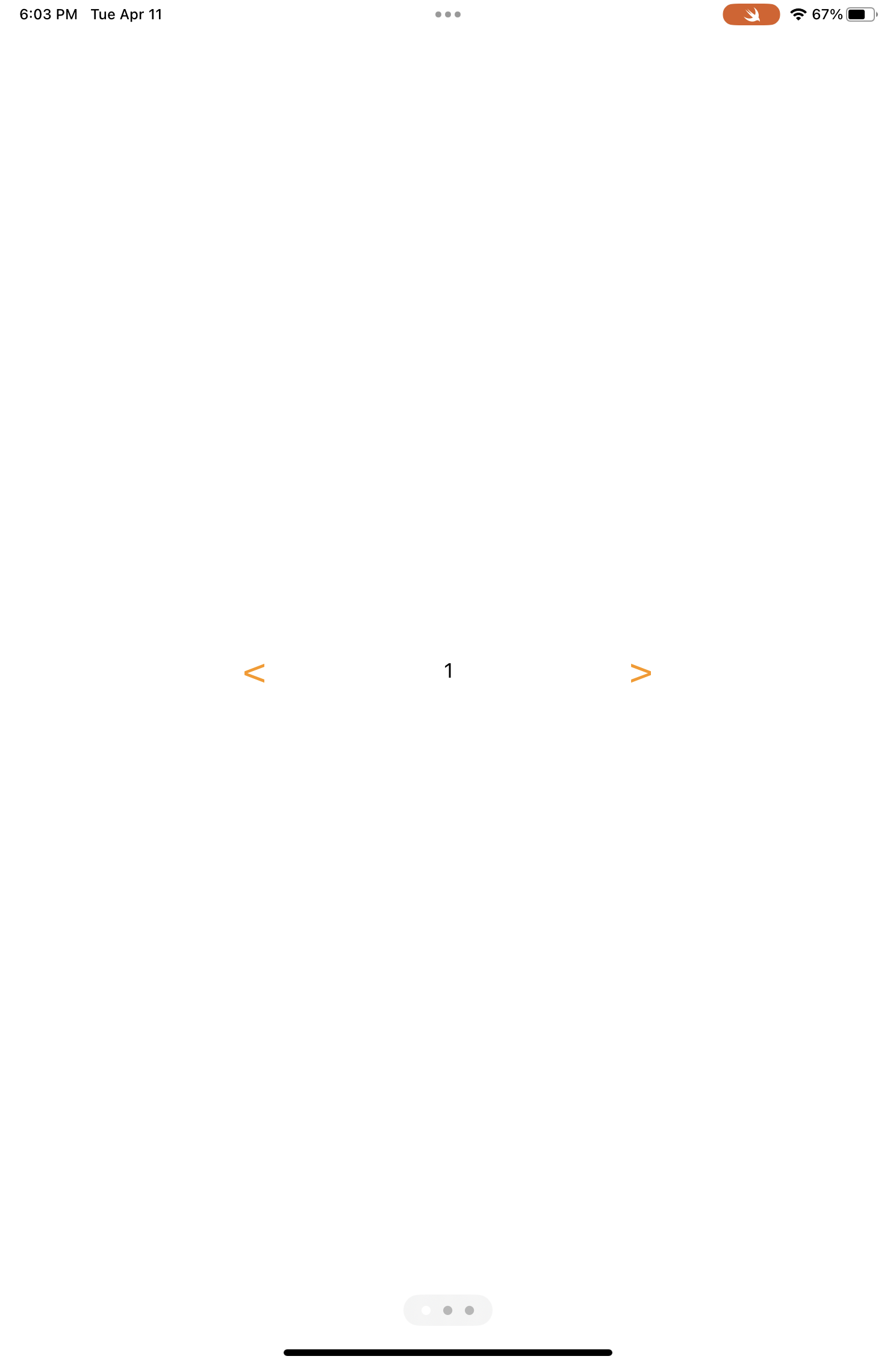 아래와 같이 버튼이 추가됐다!! 하지만 뭔가 버튼이 저 page index (동그라미들) 위에 위치시키고 싶어서 HStack을 ZStack으로 대체해봤다. 이렇게 화면을 바꾸어 보았다!! 문제는... 아이패드로 플레이그라운드를 실행했을 때 문제가 생겼다!!