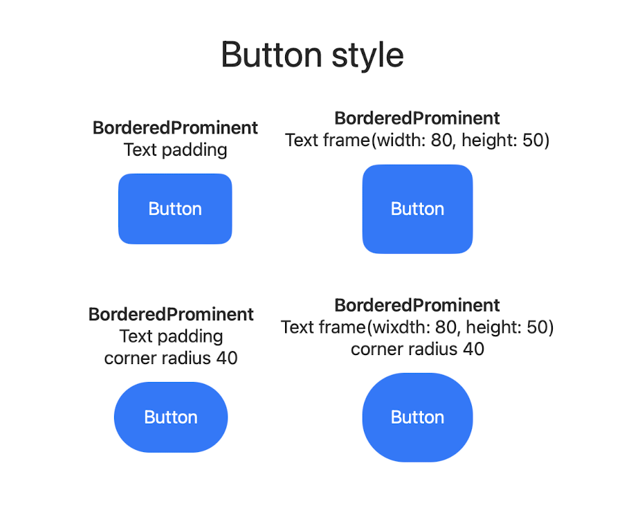 BorderedProminent 스타일 코드를 적용하려면 아래와 같다. 여기서 corner radius 등 다양한 옵션도 추가할 수 있다! BorderedProminent, Bordered의 경우는 padding이 자동으로 어느정도 추가된다.