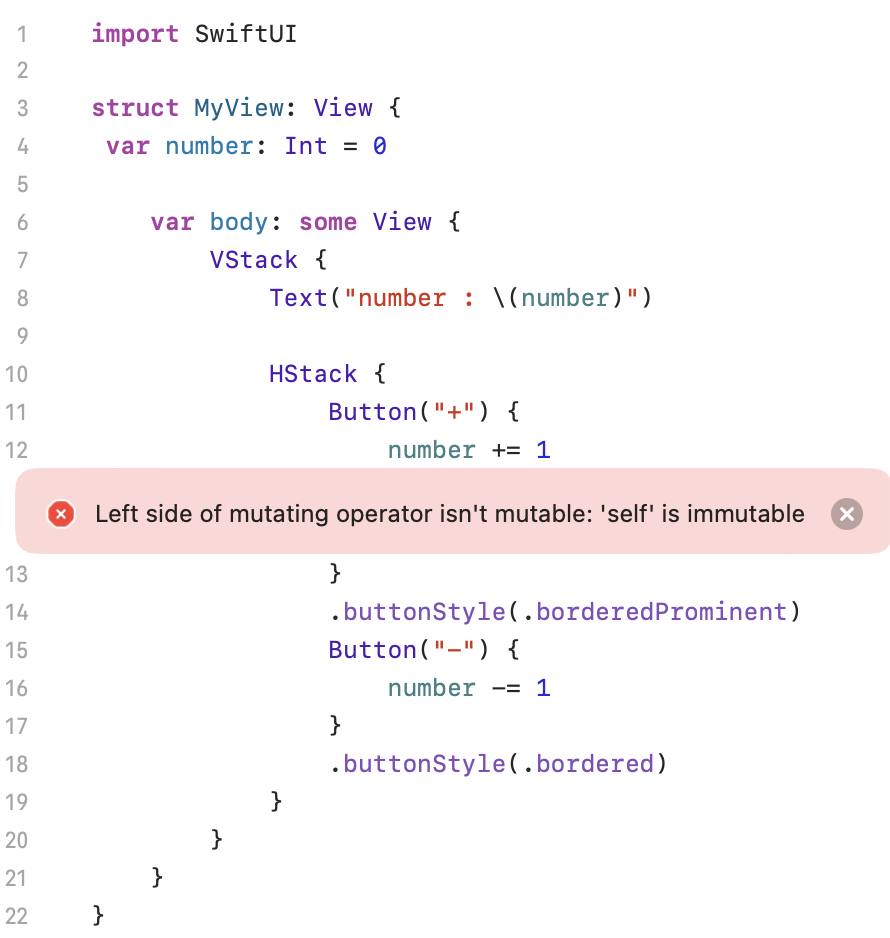 Left side of mutating operator isn't mutable: 'self' is immutable 라는 에러문구를 볼 수 있다. 해석해 보면 값을 변경할 수 없다는 것인데 이것은 구조체와 또 관련이 있다. 나중에 다루겠지만 구조체 안에 있는 값은 불변(immutable)하다. 그렇기 때문에 @State로 감싸(wrapping) 주어 속성(property) 값을 변경 가능하게 해주는 것이다. 그리고 View 업데이트도 해주게 된다.