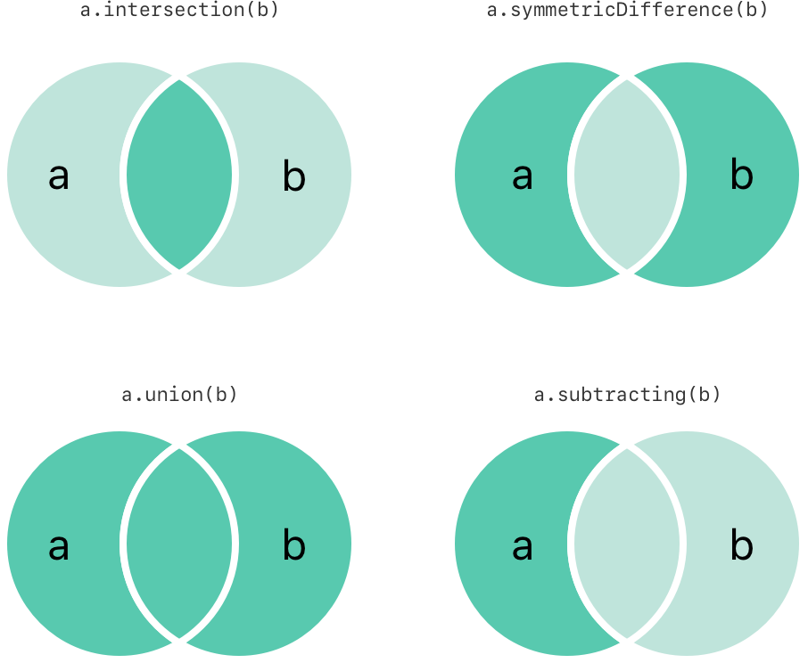 두 집합 a 와 b 의 여러가지 집합 연산이 아래 그림에 나와있다. 진한색이 결과값으로 반환된다고 생각하면 된다.