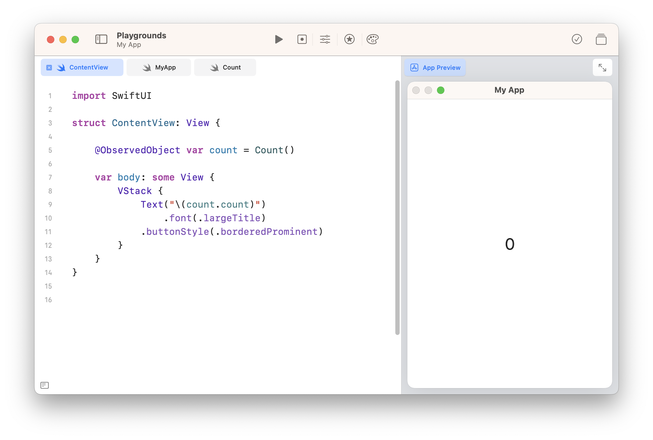 그렇게 되면 다른 뷰에서 @ObservedObject 로 감시할 Count() 를 선언해주고, 그 안의 count 변수를 가져올 수 있게 되었다.