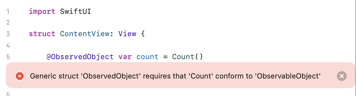 Xcode 에서 아주 친절하게도 ObservableObject 가 필요합니다. 라는 오류 문구를 보여줬다. @ObservedObject 를 사용하려면 @Published 를 사용하고 있는 class 가 ObservableObject 프로토콜(약속)을 준수해야 한다! 그래서 ObservableObject 를 class 에 넣어준다.