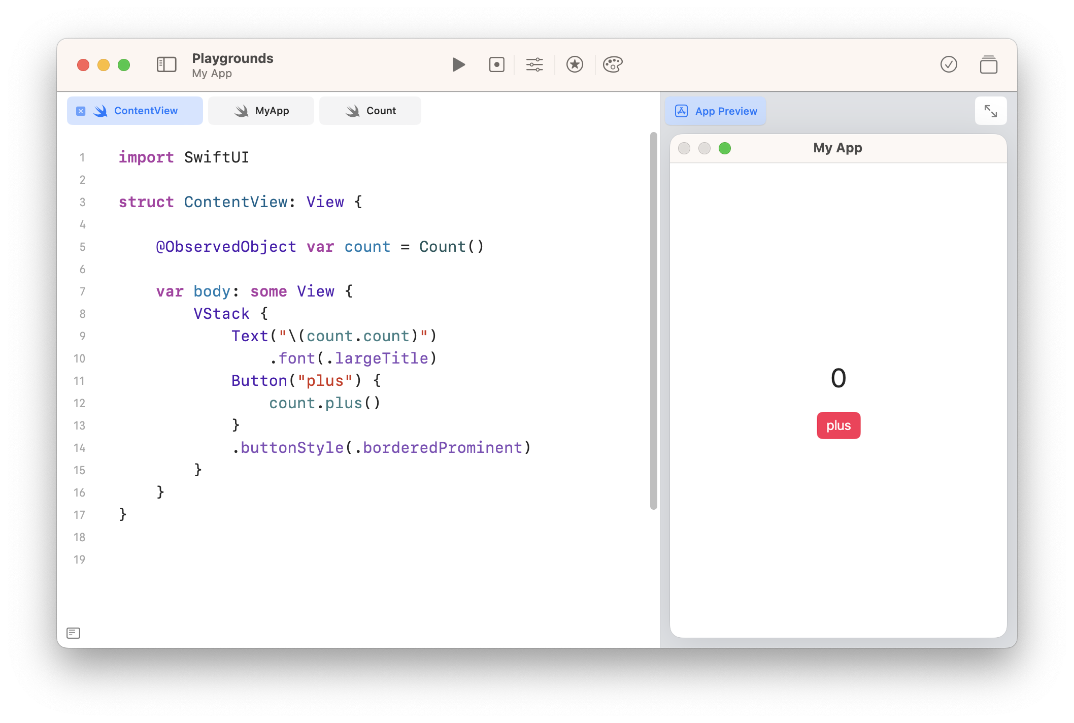 plus 라는 버튼을 누르게 된다면 count 에 1 을 더해주고, 이를 관찰하여 값이 변경되면 자동으로 뷰를 업데이트 시켜줘서 올라간 count 를 보여준다. 마치 앞에서 배운 @State 와 유사한 역할을 해준다.
