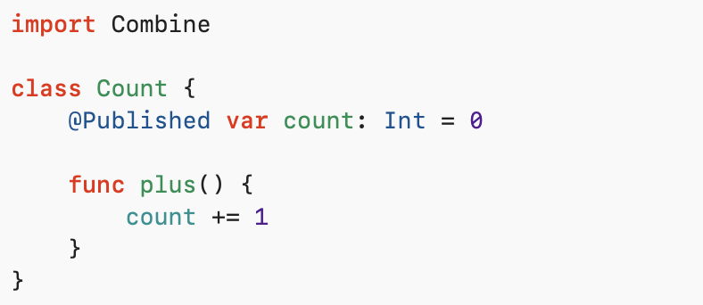 자 count 라는 변수 앞에 @Published 를 붙여줘서 count 가 변경될 때 마다 어딘가에 알려주고 싶다. count 를 감시해주는 @Published 를 붙여보자.