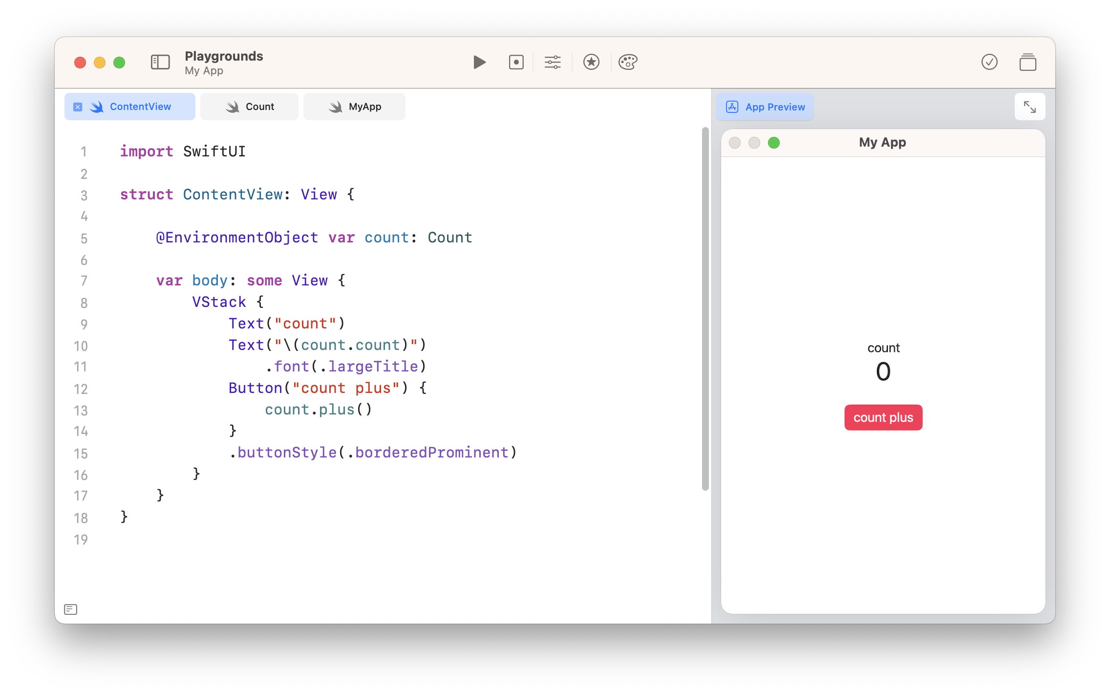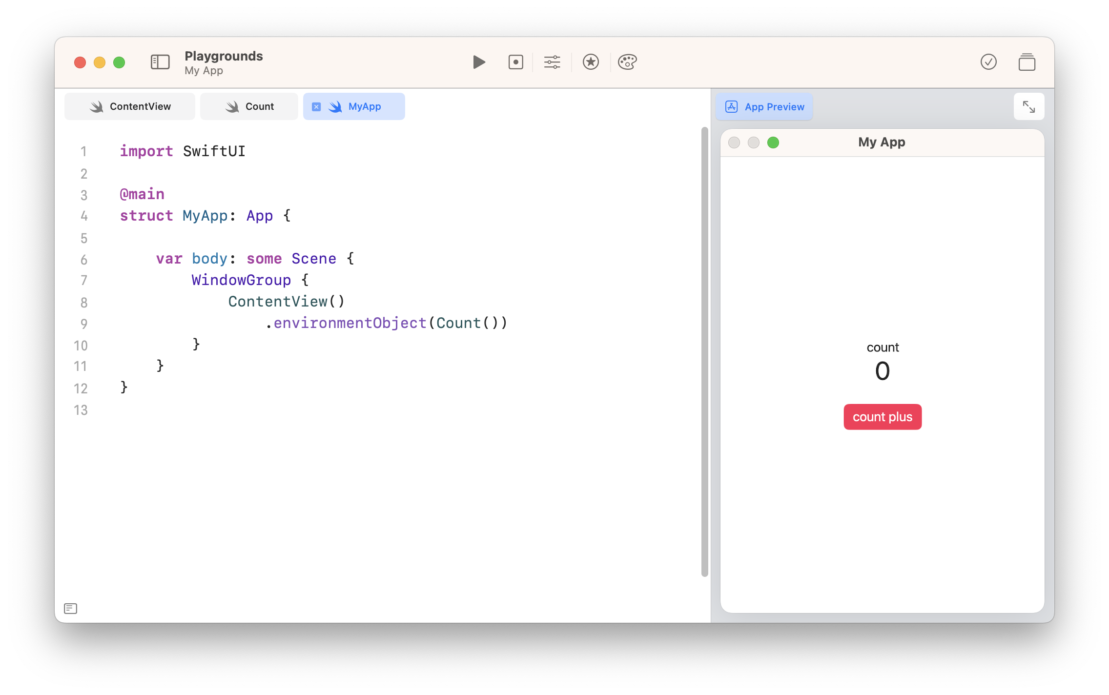MyApp 구조체에서 .environmentObject(Count()) 를 사용하여 Count() 를 ContentView 에 적용시킨다.