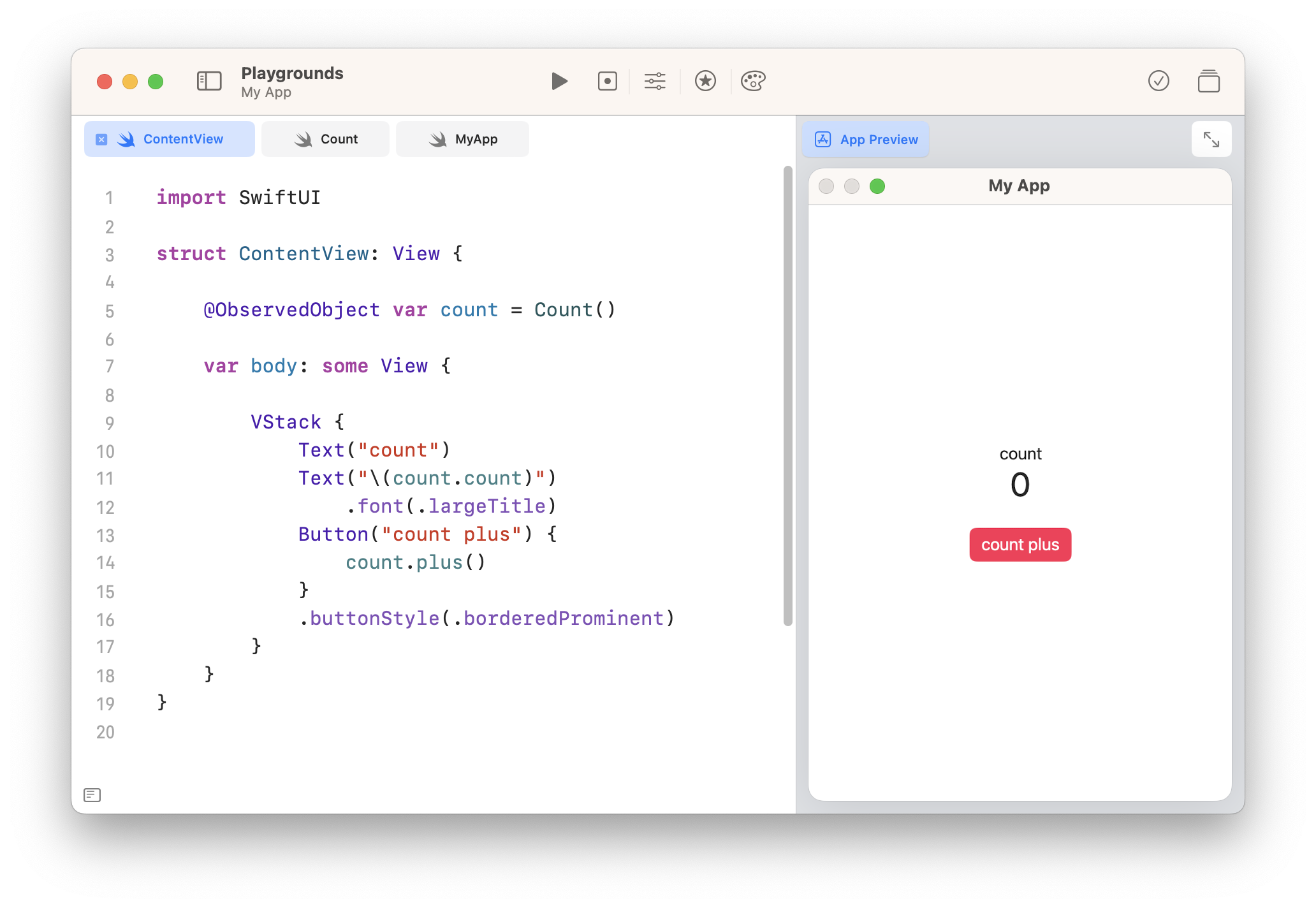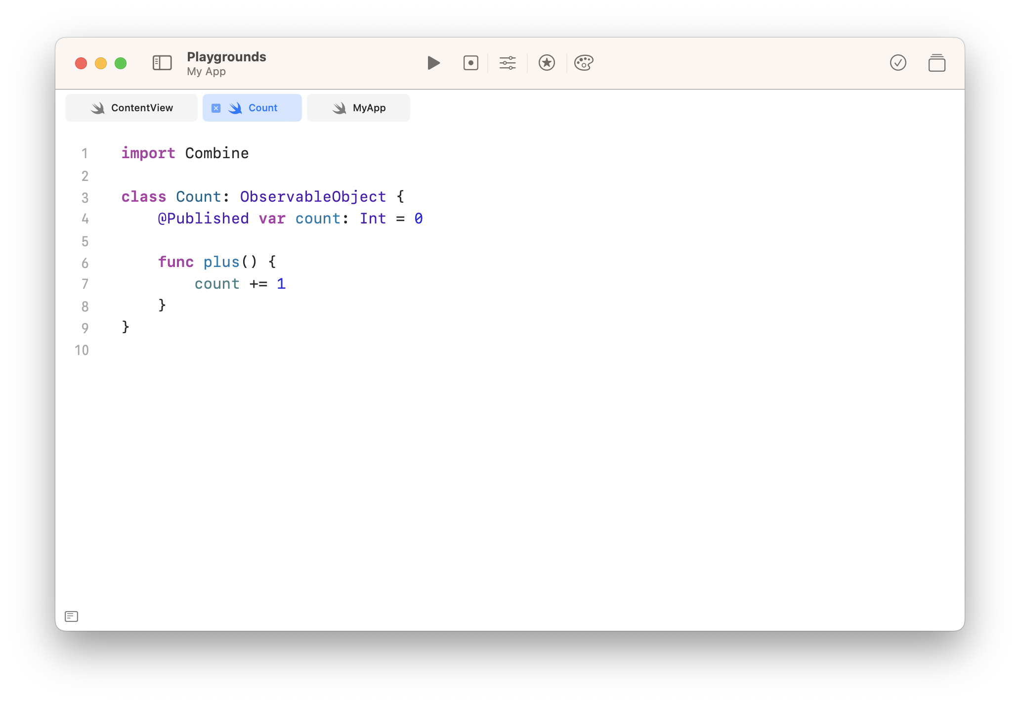 @EnvironmentObject 도 ObservableObject 프로토콜을 준수하는 클래스나 구조체가 필요하다. 따라서 아래와 같은 Count 구조체를 만들어 주었다.