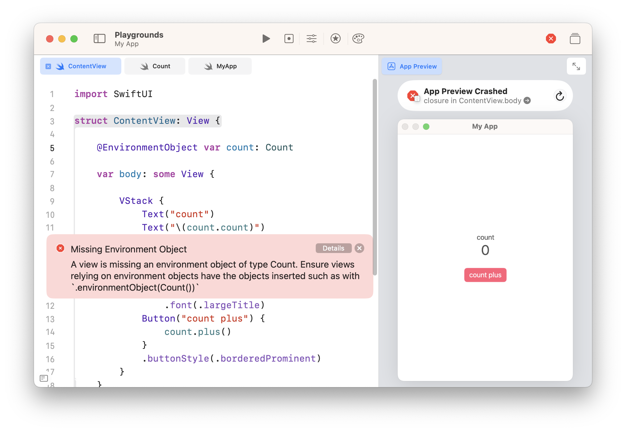 @EnvironmentObject 는 @EnvironmentObject var count: Count 형식으로 쓴다. 하지만 그렇게만 쓰면 아래와 같은 오류를 만날 수 있다. @EnvironmentObject 를 쓰기 위해서는 environmentObject(_:) 를 사용하여 어떠한 데이터를 공유할 것인지를 알려줘야 한다.